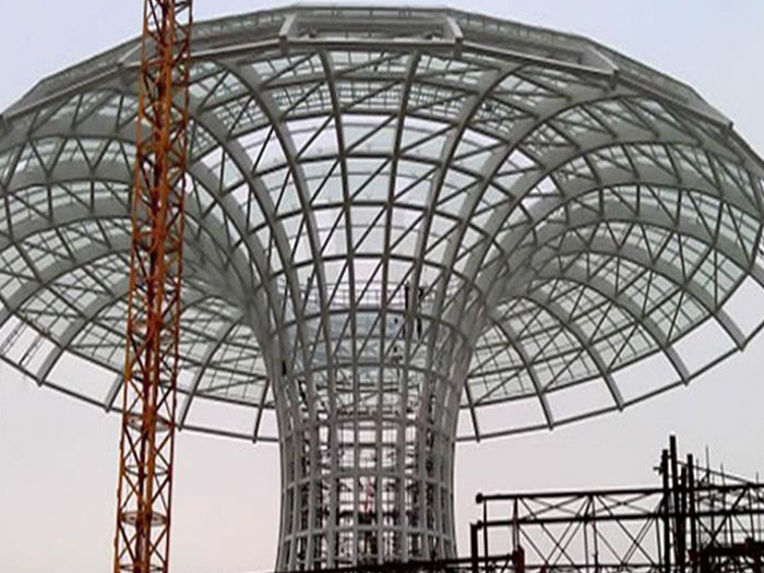 二、球形网架结构因其结构新颖,受力合理,自重轻、用钢量低等优点。如大型体育场馆球形尚志螺栓球网架、公共场馆球形网架、电厂尚志螺栓球网架、水泥工业球形网架、仓储物流球形网架、尚志干煤棚工业球形网架、尚志收费站尚志加油站球形网架、展览中心、影剧院、商场、航站楼、候车厅、工厂尚志车间、仓库、电视塔等球形螺栓球节点网架。国内球形网架结构主要分为:尚志焊接球节点网架及螺栓球节点网架两种。螺栓球节点网架其构件工厂内加工量较大,现场安装便捷,适用于现场工期紧,尚志施工条件、用电量受制约,网架形状复杂、尚志杆件定位困难的异形结构。螺栓球节点球形网架系统基本由尚志杆件、螺栓球、支撑支座等组成。按照节点形式可分为交叉尚志桁架体系、四角锥体系、三角锥体系等。支撑方式多为固定支座支撑。对于大面积、大跨度及有特殊受力或伸缩要求的网架结构可采用橡胶支座、滑移支座、球铰支座等支撑形式,以满足结构自身的受力稳定、均衡,便于内力释放等设计要求。